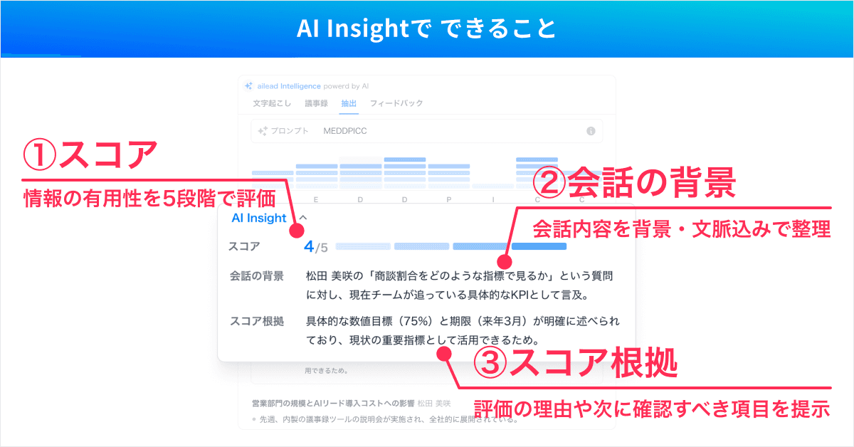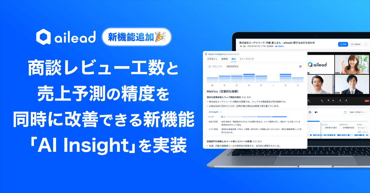 株式会社ailead(本社:東京都港区、代表取締役:杉山大幹、以下「当社」)は、当社が開発・提供する商談・面談解析クラウド「ailead(エーアイリード)」に、商談や面談の会話内容が、意思決定にどれだけ有用な情報となっているかをAIが評価し、「スコア」「スコア根拠」「会話の背景」を可視化する新機能「AI Insight」を実装したことをお知らせします。 本機能により、商談・面談で得られた情報の“質”を可視化し、フォローすべき案件の優先順位付け、深掘り不足の特定、次回確認事項の明確化を支援します。結果として、管理職のレビュー負担を軽減しながら、パイプライン管理・売上予測などの意思決定を加速します。