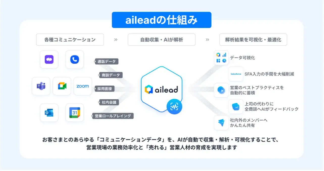 商談・面談データ解析クラウド ailead(エーアイリード)は、“営業・人事部長の右腕”として、業務効率化と人材育成を通じた生産性向上を支援するツールです。